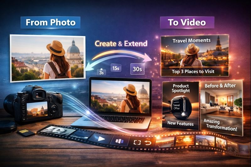 Photo-to-video gives you a base. Extending gives you scale. Together, they turn one good image into a small library of publishable clips—fast enough to keep up with how the internet actually moves.
