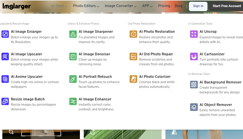 Open your web browser and navigate to the Imglarger website. You’ll find a comprehensive suite of AI tools organized into three categories: AI Tools for enhancement and upscaling, Image Editing Tools for basic adjustments, and Image Converters for format changes. No account creation is required to get started, though registering unlocks additional features like batch processing and higher resolution outputs.