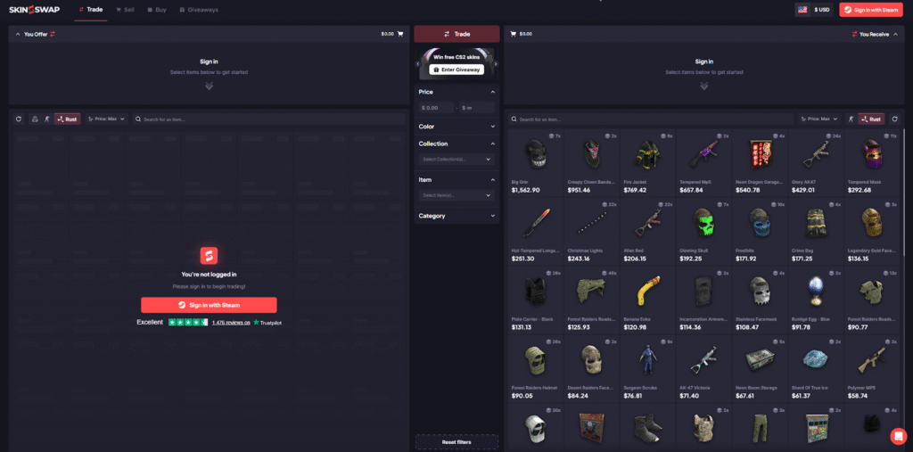 SkinSwap are excellent platforms for trading Rust skins, offering user-friendly interfaces and robust security features. Their positive user reviews further affirm their reliability in the trading community.